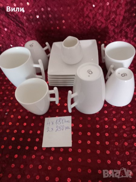 Изискан, елегантен и нестандартен сервиз от снежнобял порцелан, състоящ се от 4 чашки с подложни чинийки за кафе еспресо и 2 чаши с подложни чинийки за капучино или чай. Каничката за мляко е подарък.