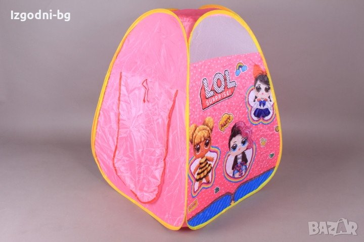Сгъваема текстилна палатка с гъвкава метална арматура и два отвора за вход / изход. Подходяща, както за игра на открито, така и за игра на закрито. Лесна за разгъване и прибиране.