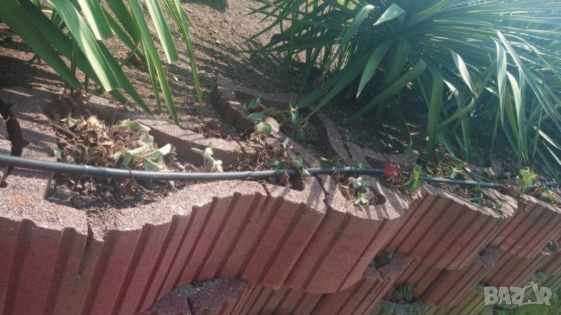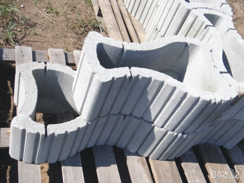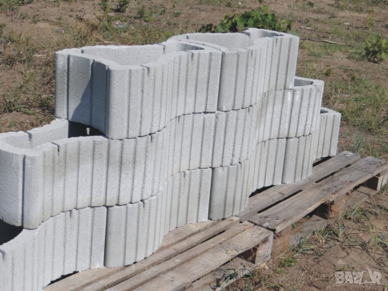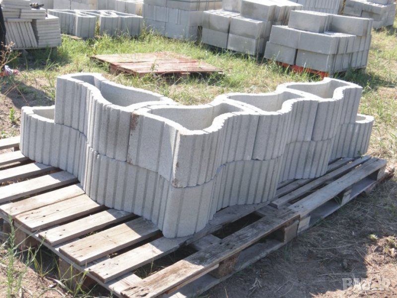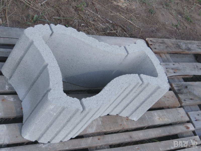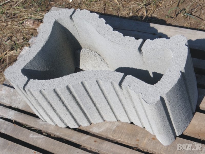 --БЕТОННИ блокчета с кухина и с декоративна структура. Кухината на блокчето се пълни с пръст --Заоблената форма на блокчетата позволява зидарията да прави всякакви завои и ъгли. Стъпаловидната зидария позволява в блокчетата да се сеят растения.