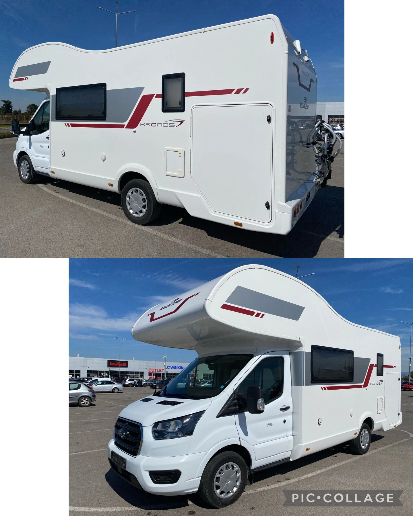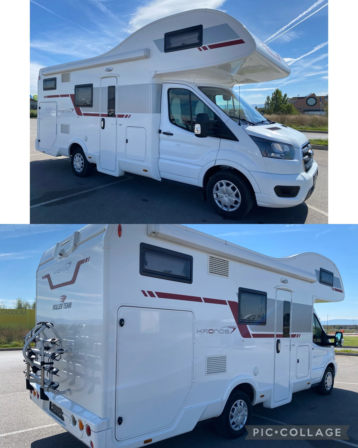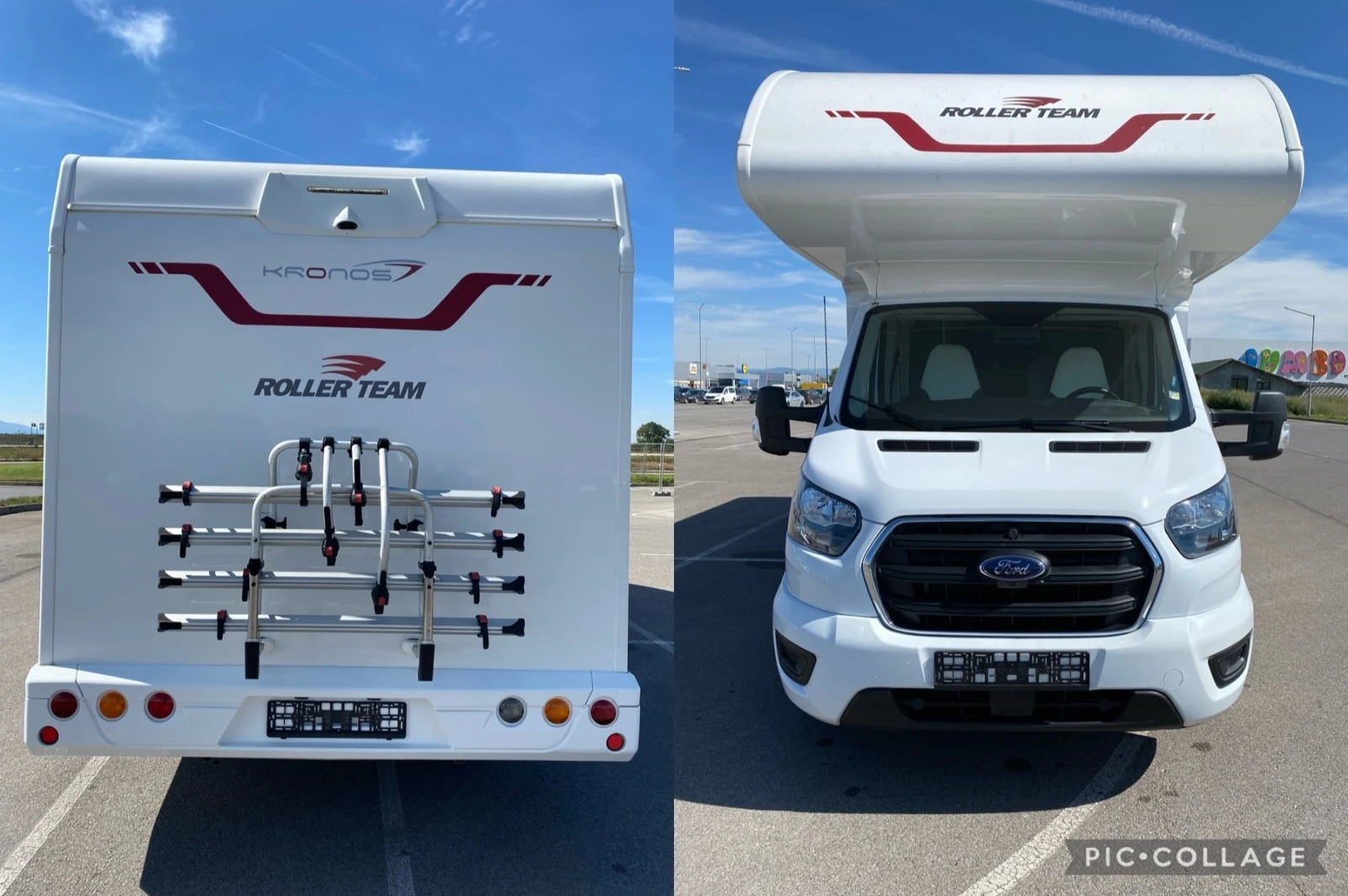 Roller Team kronos 295 M Шаси Ford Transit Двигател 2. 0 , 130к. с. Euro6temp Дължина 6. 99м Ширина 2. 35м Височина 3. 15м Теглич Летни и зимни гуми Брой места за пътуване - 4 Брой места за хранене 4 Брой места за спане - 4 Климатик към двигателя, круиз контрол, дневни светлини Въздушни възглавници за водача и пътника Електрически странични огледала Камера за заден ход Радио USB Мултиволан с управление Кожен салон Климатик в жилищната част Панел TRUMA CP PLUS iNet 100% LED осветление Амбиентно осветление Напречно легло в задната част Второ двойно легло в алковен над водача Голяма баня с тоалетна + SOG ( вентилационна система ) + външен душ със смесител Тента THULE 4 м. с LED осветление 4 м. Отопление на газ - Truma Соларен панел Автоматична