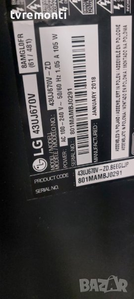 борда е гарантирано работещ Демонтиран от телевизор LG модел. 43UJ670V-ZD със счупен дисплей HC430DGG-ABTL1-A11X тесвана от нашия техник