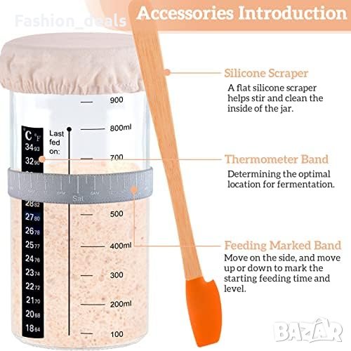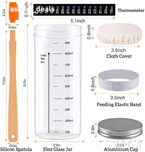 В комплекта е включен термометър за незабавно отчитане на температурата на закваската, за да се гарантира, че тя остава в оптималните граници за ферментация. Лентата за проследяване на деня на хранене ви помага да прецените покачването на закваската.