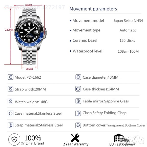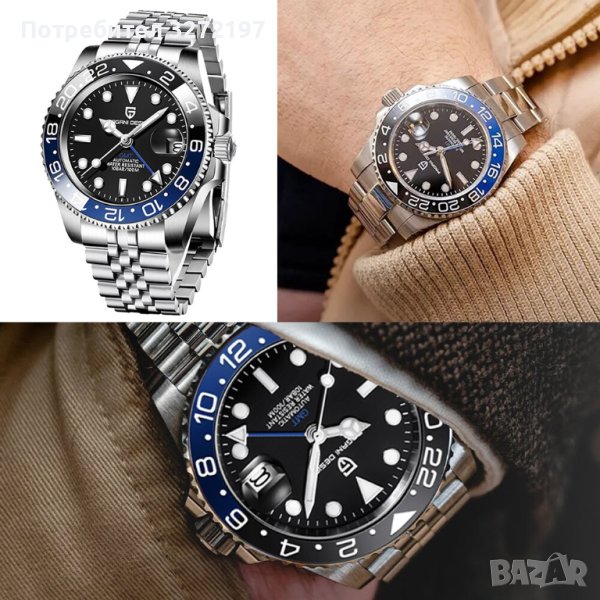 PAGANI DESIGN автоматичен часовник с Японски маханизъм SEIKO NH34 GMT,стъкло сапфир,водоустойчив,неръждаема стомана,изключително точен механизъм,ярко фосфоресциращ безел и стрелки.