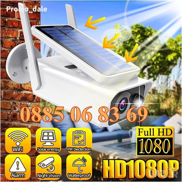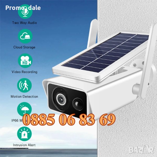 Соларна безжична Wi-FI PRO камера с автномно захранване. Full HD резолюция, вграден говорител и слот за SD карта с памет до 128GB. Камерата разполага с PIR сензор за детекция на движение и дава възможност за нощно видеонаблюдение до 20 метра. Отдалечено наблюдение в реално време и преглед на записите през мобилно устройство с приложенията и ICSee или. Поддържа две акумулаторни батерии тип 18650. Заряд на батериите чрез соларния панел. Соларният панел е подвижен и дава възможност за регулиране на ъгъла на приемане на сълчевата светлина. Подходяща за външен монтаж.