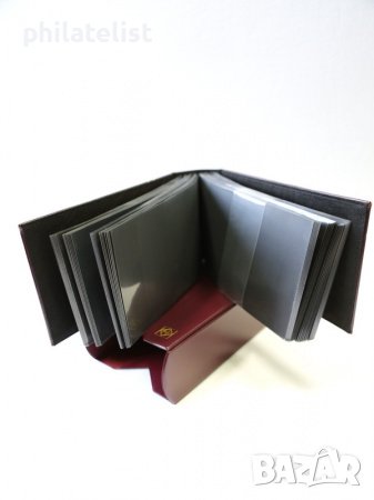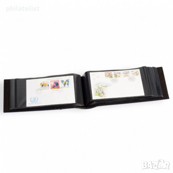 С 50 двустранни, прозрачни листи без пластификатори, с вградено черно разделително фолио, за 100 плика. Джобовете са затворени от три страни, свързани с гърба и могат да се поставят отгоре.