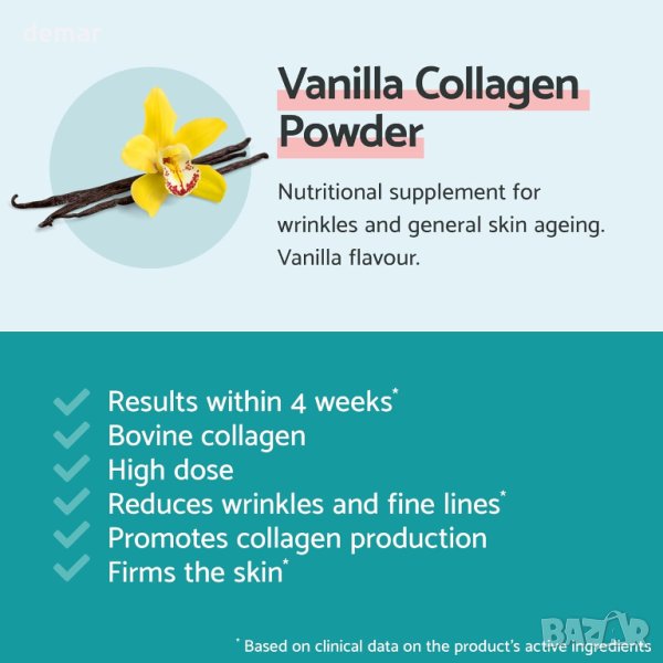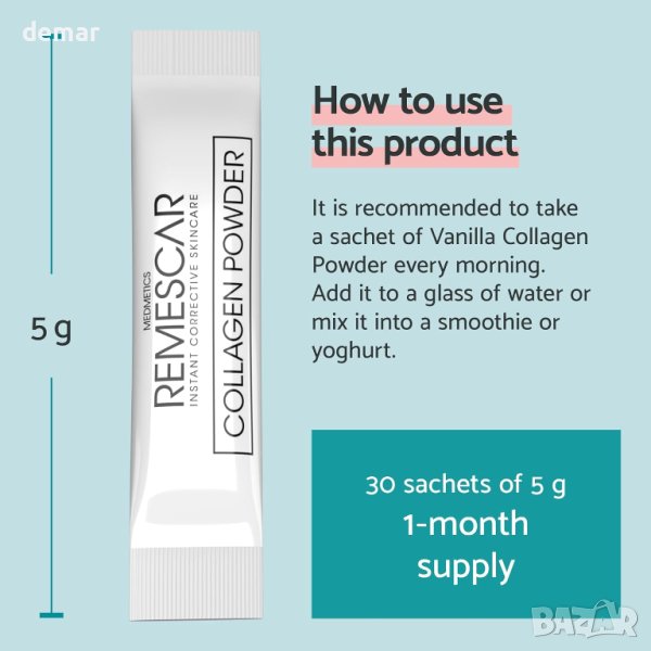 Колагенът е жизненоважен протеин в тялото, намиращ се в кожата, костите, мускулите и съединителните тъкани. Играе жизненоважна роля за поддържане на еластичността на кожата и здравето на ставите. Този прах е предназначен да осигури бърз и лесен начин за повишаване на нивата на колаген в тялото. Той използва говежди колаген, известен с високата си бионаличност, което означава, че се абсорбира ефективно от тялото. Добавката съдържа биотин (витамин В7) и цинк, като и двата допринасят за поддържането на нормална кожа. Биотинът има допълнителни ползи за здравето на косата, а цинкът помага за защитата на клетките от оксидативен стрес. Тези твърдения са подкрепени от Европейския орган за безопасност на храните (EFSA). Хиалуроновата киселина е известна със своите ползи за кожата, като осигурява повишена хидратация и насърчава здрав вид на кожата. Той също така служи като възглавница и смазка в ставите. Витамин С допринася за нормалното образуване на колаген, който е от съществено значение за функцията на кожата, а също така играе роля в защитата на клетките от оксидативен стрес. Продуктът е предназначен за ежедневна употреба. Потребителите се инструктират да разтворят едно саше от праха с аромат на ванилия в 150 ml вода. Всяко саше съдържа 5 g прах, а кутия съдържа 30 сашета, осигуряващи едномесечен запас. Колагенът на прах може да се смесва с различни храни и напитки, като смутита, каша, кисело мляко или протеинови шейкове, което го прави удобен начин за включване на колаген, витамини и минерали в ежедневието.