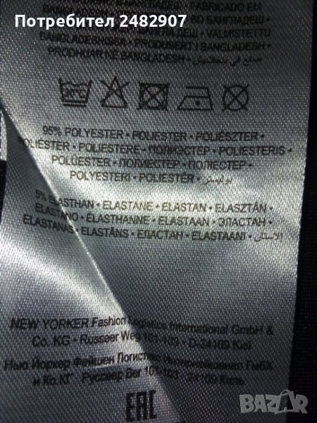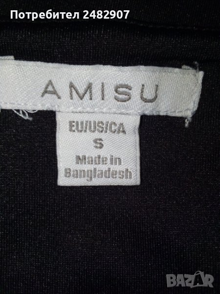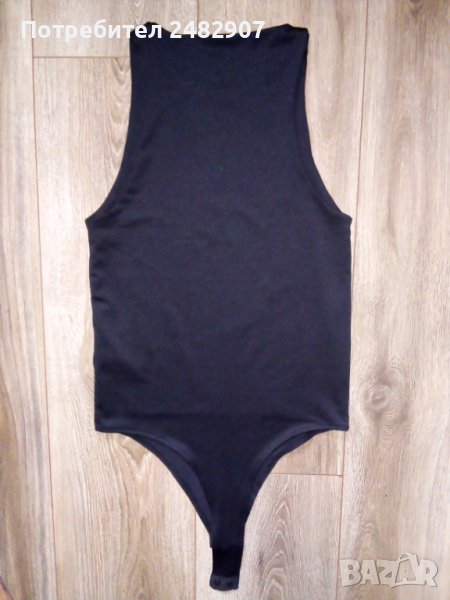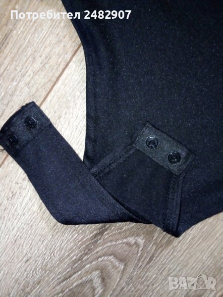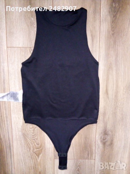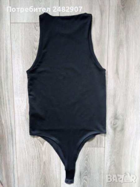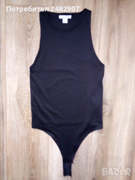 Черно дамско боди с подплата, тип прашка, размер S. Съдържа 95 % полиестер и 5 % еластан и закопчаване с две тик-так копчета отдолу. Ширина в раменете - 21 см, ширина под мишниците - 32 см, ширина в долната част - 33 см, дължина от рамото до долния край на прашката (в закопчан вид) - 68 см. Чисто ново, само е пробвано.