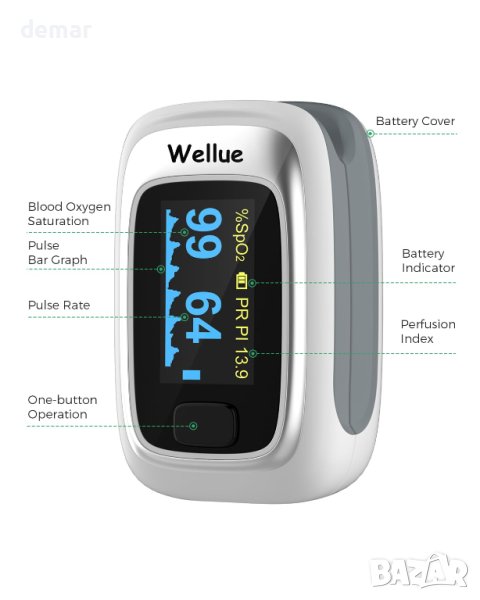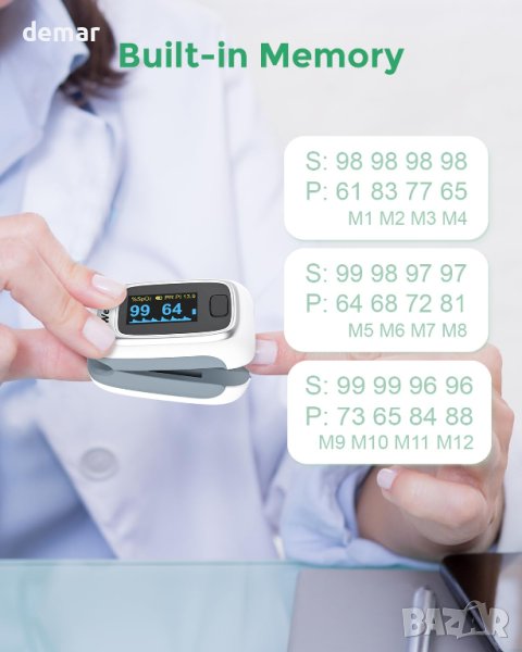 кислород (SpO2), пулсова честота или перфузионен индекс (PI) са извън предварително зададените прагови стойности, устройството ще задейства аларма със зумер. Освен това съответното показание ще мига на екрана на устройството, предупреждавайки потребителя за ненормални стойности. Този пулсов монитор използва усъвършенстван сензор за пръсти, който използва инфрачервена светлина, за да открие движението на тялото и да събере прецизни измервания на SpO2, PI и честота на пулса. Това гарантира точни и надеждни данни за наблюдение на вашето здраве. Пръстовият оксиметър има функция за памет, която може да съхранява до 12 групи записи. Потребителите могат да имат достъп и да преглеждат историческите си данни директно на устройството. Освен това продуктът предлага опция за заглушаване или изключване на звуковия сигнал в настройките на устройството. Използването на пръстовия оксиметър е лесно. Просто го носете на пръста си и той веднага ще започне да измерва вашите стойности на SpO2, пулсова честота и PI. Резултатите се показват на OLED екран, който е надграден, за да предоставя ясна и лесна за четене информация.