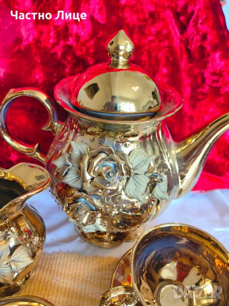Разкошен Старинен Позлатен Порцеланов Сервиз Комплект за Чай с Релефни Рози
