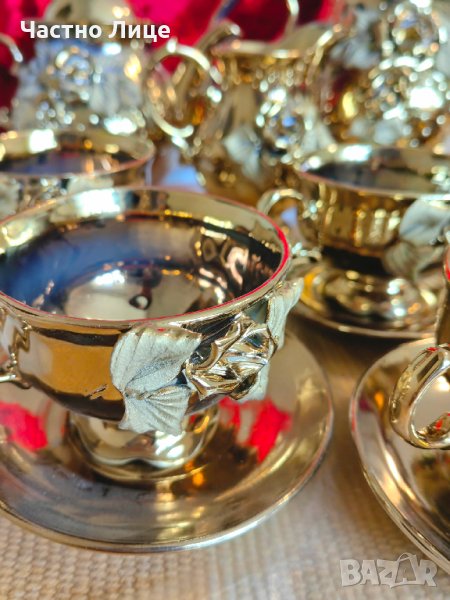 Сервизът се състои от 9 части- 2 кани за чай , 1 кана за мляко и 6 чаши с чинийки. Едната чаша има лека забележка, показана на предпоследната снимка. Каните са с височина 15, 20 и 14 см съответно.