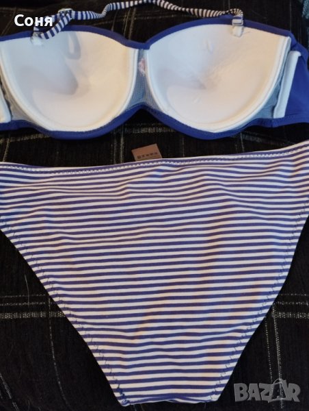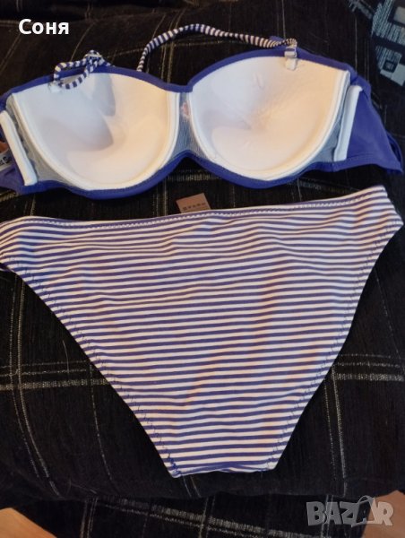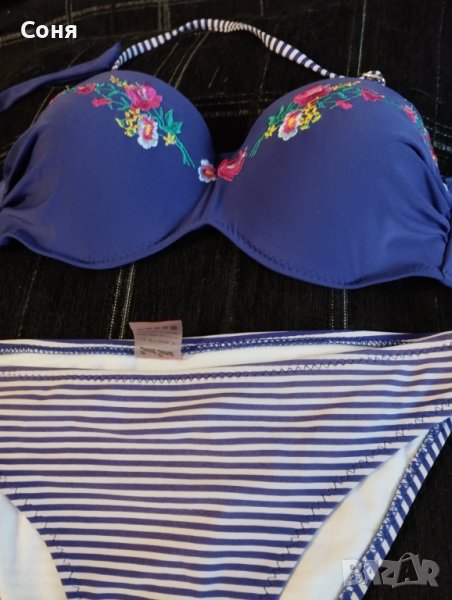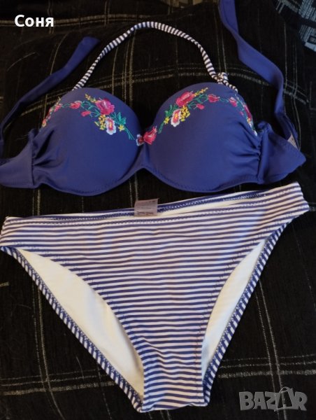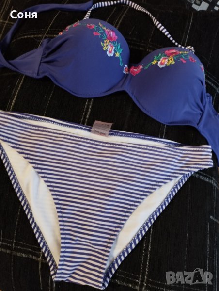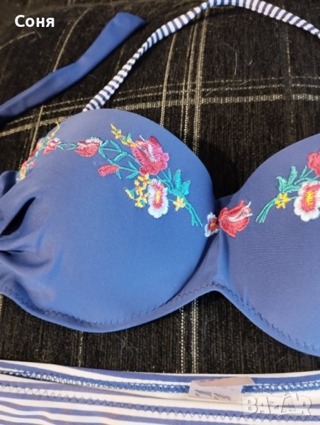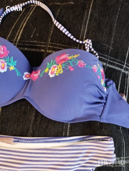 Бански костюм от две части размер S, нов, без етикет, твърди чашки със банели, може да се носи и като бриджитка, с връзки на гърба, цвят индигово синьо с красива бродерия в горната част и долнише в синьо-бели раета.