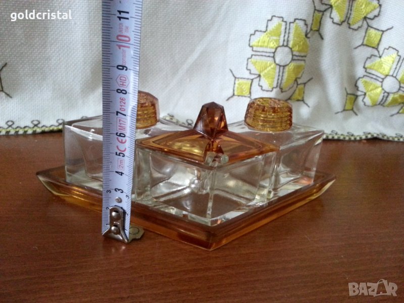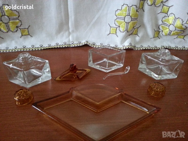 Стъклен комплект за подправки цветно стъкло и стъклена лъжичка без забележки без липси сервиз комплект сет лот ретро арт декор винтидж колекция стари антикварни предмети обзавеждане за дома и семейството подходящи за подарък за ценители и колекционери