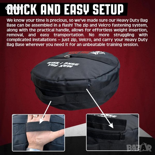 Настройването на базата за тежки торби е проектирано да бъде бързо и лесно. Той използва система за закопчаване с цип и велкро, заедно с практична дръжка, което улеснява поставянето и премахването на тежести за вашата тренировка. Това елиминира необходимостта от сложни инсталации, което ви позволява бързо да настроите вашето оборудване за обучение. Основата за тежка чанта включва 8 мм заварен D-пръстен от неръждаема стомана като здрава точка на закрепване. Този D-пръстен е тройно зашит за максимална издръжливост, осигурявайки сигурно закрепване на вашата боксова торба или двойна скоростна торба. Тази стабилност е от решаващо значение за една продуктивна тренировка. Комбинацията от система за закопчаване с цип и велкро, заедно със способността да поддържа тежести до 25 кг, осигурява непоколебима стабилност. Той предотвратява люлеенето и прекъсванията по време на тренировката ви, позволявайки ви да се съсредоточите върху подобряването на вашата техника и сила. Макар че Heavy Duty Bag Base е изключително здрава, тя се препоръчва за използване с леки оперативни чували за перфориране, като двустранни оливкови торби или скоростни торби. Това помага за удължаване на издръжливостта на основата и осигурява сигурна опорна точка за вашето обучение. Heavy Duty Bag Base е преносима и се доставя с практична дръжка, която ви позволява да тренирате навсякъде, където решите. Независимо дали е във вашия домашен фитнес, на открито или по време на тренировки в движение, тази база предлага гъвкавост и удобство.