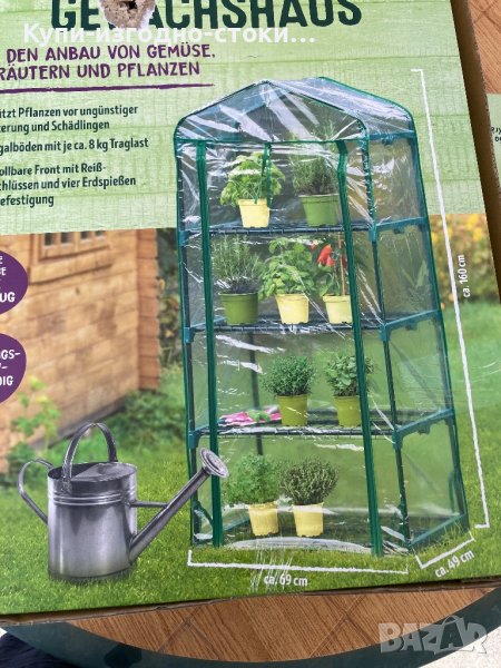 оранжерия, която е идеална за отглеждане на растения, цветя и зеленчуци. Със своите размери от 69 x 49 x 160 сантиметра (ширина x дълбочина x височина), когато е сглобен, той предлага четири нива, които могат да бъдат оборудвани със саксии за цветя и други подобни.