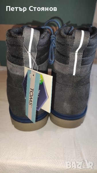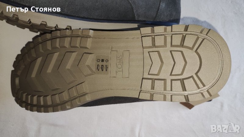 Предлагам разкошни мъжки боти на реномираната марка Toms. обувките са купени през миналата година в Холандия на цена от 69.99 евро при редовна цена от 119 евро. Изработени са от естествен велур, цветът е сиво. Хастарът и стелката са от топъл полиестер, водоустойчиви са. Подметката е от полиуретан, шити и лепени, имат два комплекта връзки - сини и сиви. Дължината на стелката е 31 см, височината на тока е 3.5 см., всочината на цялата обувка е 18 см. Изпращам с избран от купувача куриер и възможност за преглед и тест.