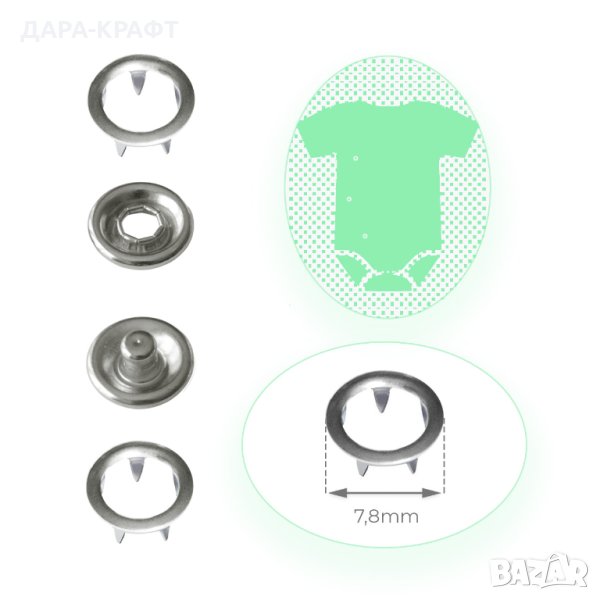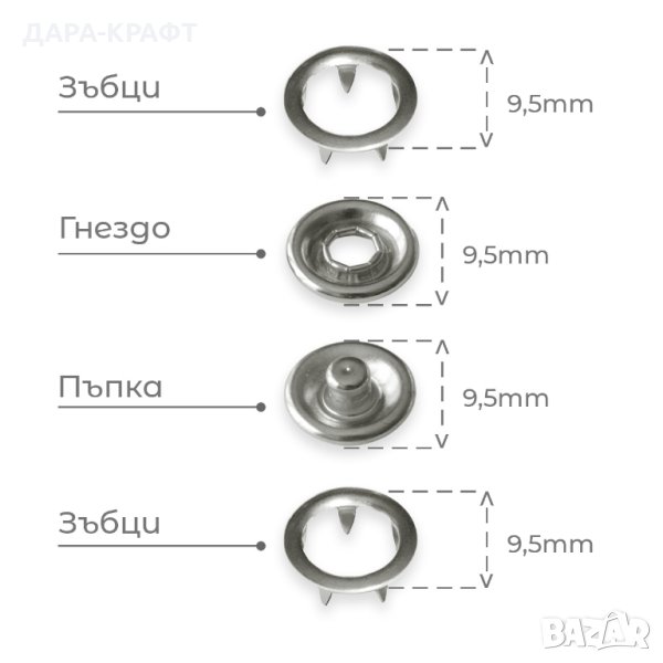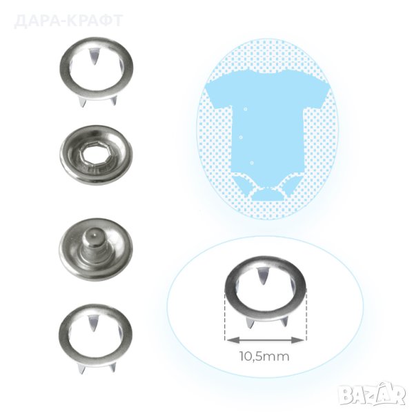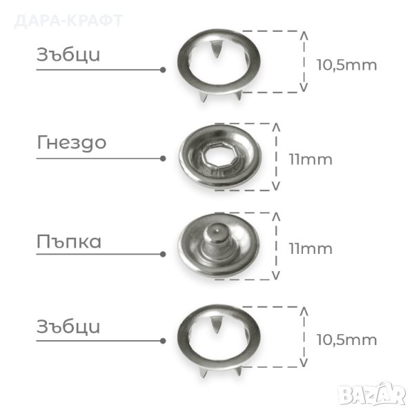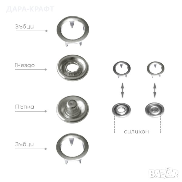 • Монтаж - частите със зъбци се прикрепват към страната със силиконов ринг на гнездото и пъпката чрез използване на матрица и преса за поставяне на този вид копчета (пресата и матриците не са включени в коплекта)