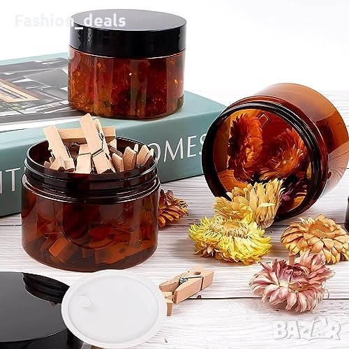 4 празни кехлибарени пластмасови буркана с черни капачки