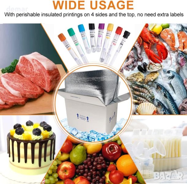 СТРАХОТНО ЗА – изпращане, изпращане по пощата, опаковане на бързоразвалящи се замразени студени кърма, месо, риба, плодове, шоколад, торта или всяко друго хладилно съхранение. Чудесно за нощна и приоритетна пощенска доставка;