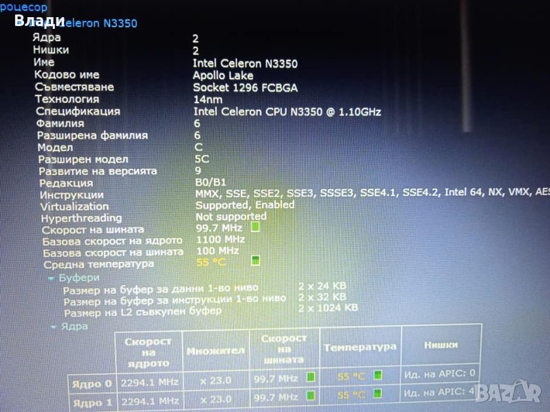 Процесор Intel Celeron N3350 (2-ядрен, 1.10 - 2.40 GHz, 2MB кеш)