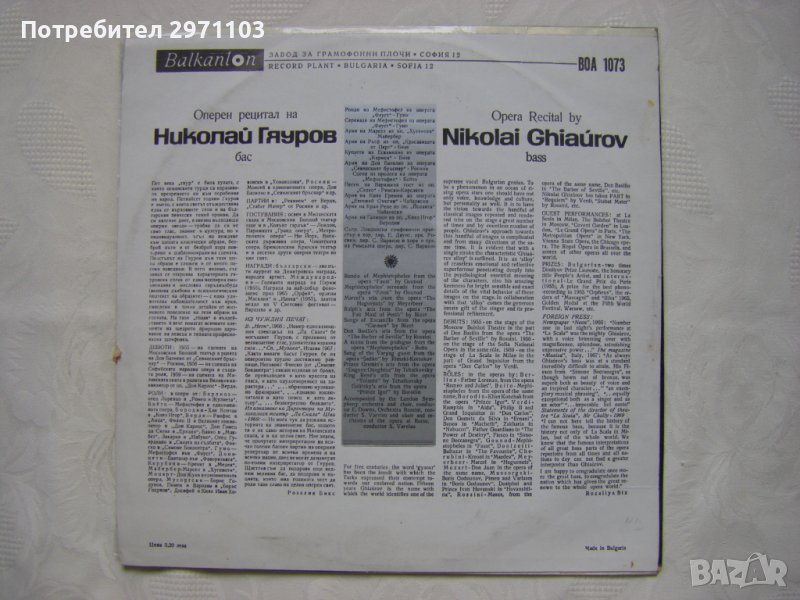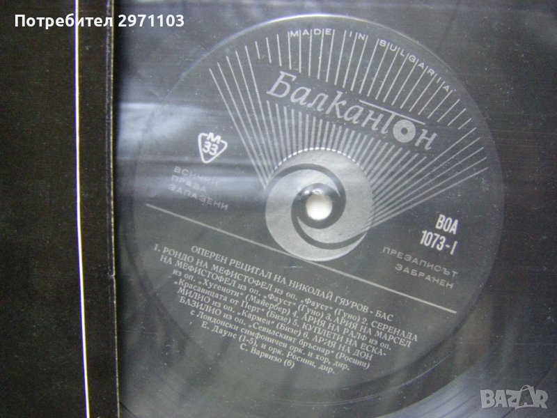 Грамофонна плоча - ВОА 1073 - Оперен рецитал на Николай Гяуров - бас
