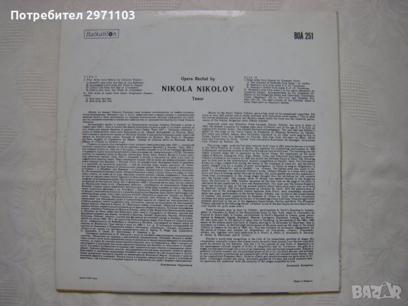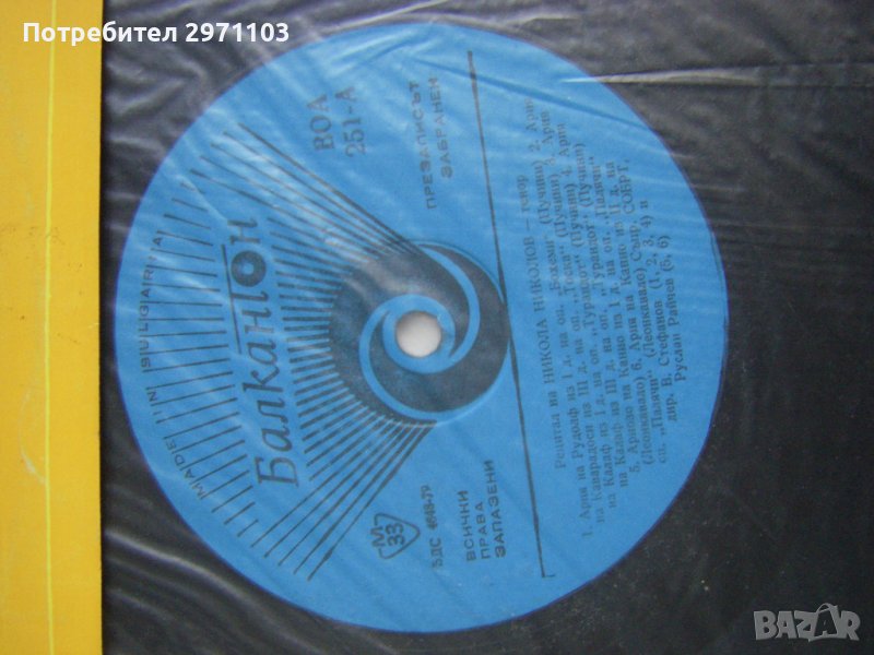 Грамофонна плоча - ВОА 251 - Никола Николов, тенор. Оперен рецитал