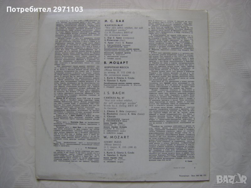 Грамофонна плоча - 33Д-017685/6 - Иоган Себастьян Бах*, Вольфганг Амадей Моцарт* – Кантата № 47 / Короткая месса , Мелодия, 1968 година.