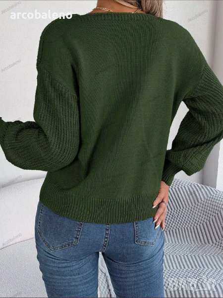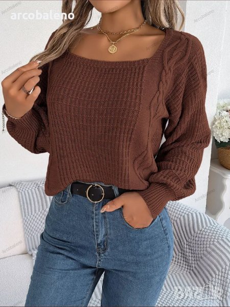 Дамски едноцветен плетен пуловер с квадратно деколте и усукани ръкави с фенери, 3цвята