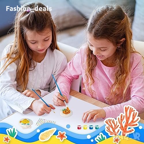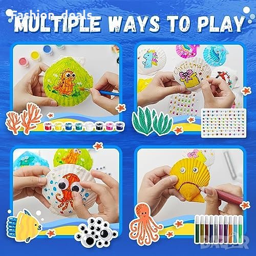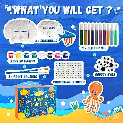 ецата могат допълнително да подобрят своите произведения на изкуството от черупки, като добавят диамантени украшения или различни малки аксесоари. Естествените черупки са специално обработени, за да се гарантира безопасността по време на процеса на рисуване. Всички бои, включени в комплекта, са безопасни и нетоксични, което го прави подходящ за деца на възраст над 5 години.