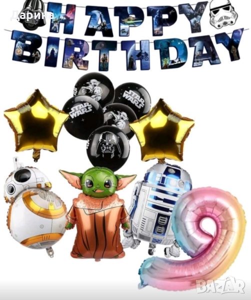 Парти сет Star Wars - Състои се 5бр. фолиеви балони - 1бр. бебе Йода 57/72см., 1бр. ВВ-8 46/70см., 1бр. R2-D2 48/58см, 2бр. звезди, 5бр. латексови балони, 1бр. цифра 80см. (Цвят по избор) и 1бр. банер - 35лв./17.90см.