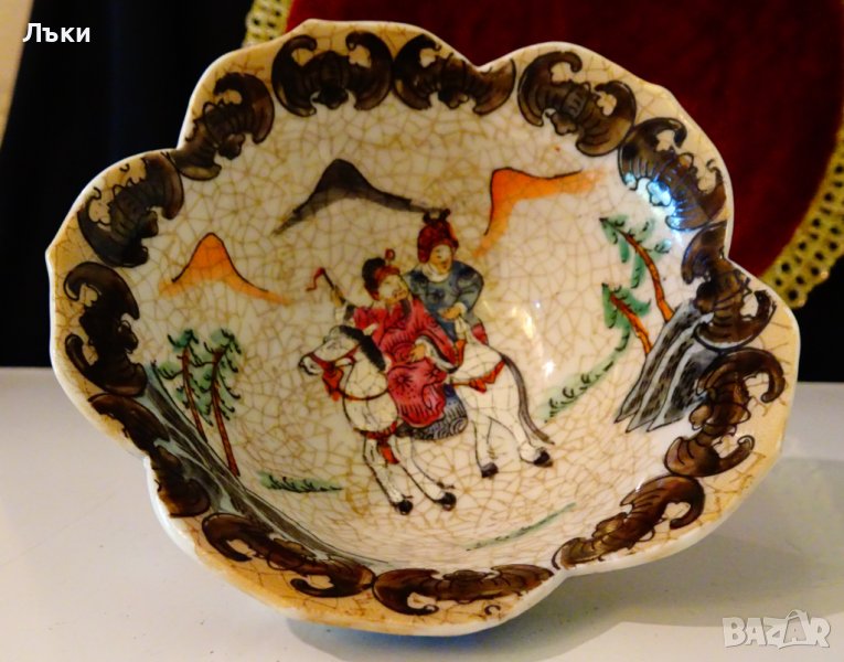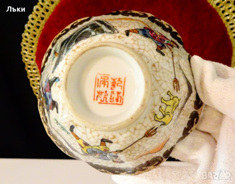 Старинна купа,купичка за ориз,съд за ядки,китайски фин порцелан с дизайн на лотос,ръчно рисувана с ловна сцена,кон с ездачи,накацали прилепи по края.Маркирана Qianlong Nian Zhi,датира от 1950 г.,късна династия Цин.Височина 6 см.,диаметър 11.5 см.