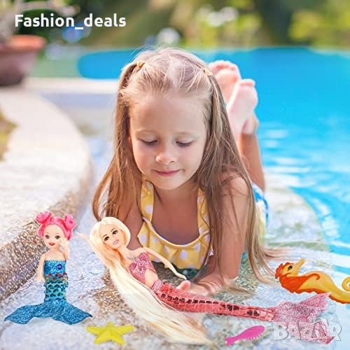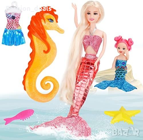 Включва 12-инчова кукла русалка, 4-инчова малка русалка, морско конче, модна рокля и 2 четки (морска звезда и риба).