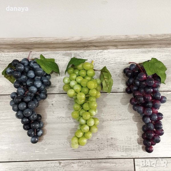 Реалистична изкуствена чепка грозде – бяло, черно и червено грозде. Изкуствени плодове, чудесни за декор и украса в битов кът, кухня, декориране на заведения, магазини и всякакъв тип помещения. С дупка за закачане на върха на дръжката си. Изключително ефектни, като истински!