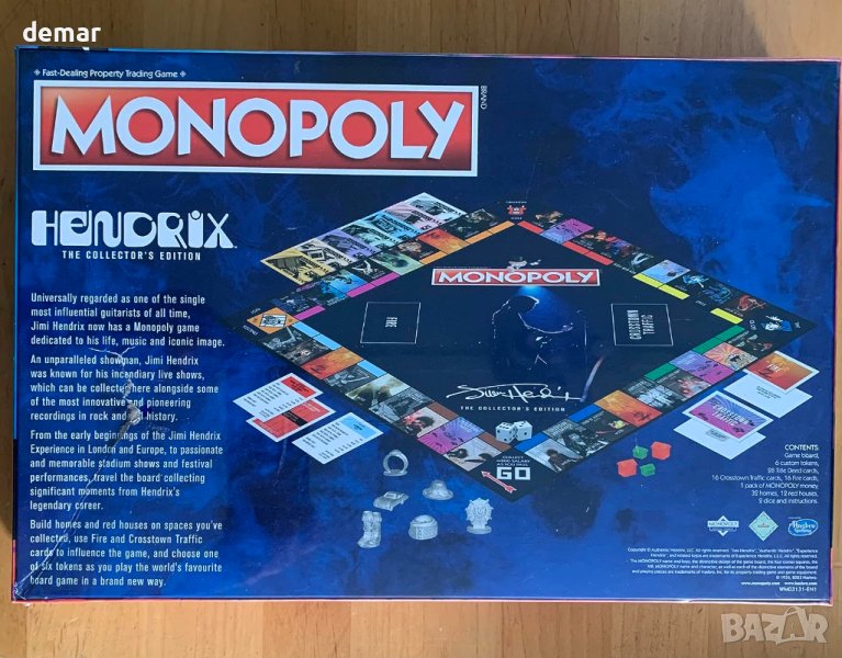 Ново издание на класическата настолна игра на Hasbro Monopoly, предназначена за 2–6 играчи, идеална за фенове на възраст над 12 години, които са ентусиасти на Джими Хендрикс. Това издание включва 6 персонализирани метални жетона, включващи емблематични символи като шапка, медальон и ботуши. Ще обиколите разпознаваеми пространства, представящи албумите, концертите и групите на Хендрикс. Игралната дъска показва зашеметяваща фотография на най-великия китарист в света Джими Хендрикс. Използвайте пари от Monopoly, които изобразяват музикални формати от различни епохи, за да купувате цветни комплекти и да разширите своята музикална империя с домове и червени къщи. Бъдете нащрек за карти Fire и Crosstown Traffic, които могат или да помогнат, или да попречат на шансовете ви за успех, докато се стремите да доминирате в играта.