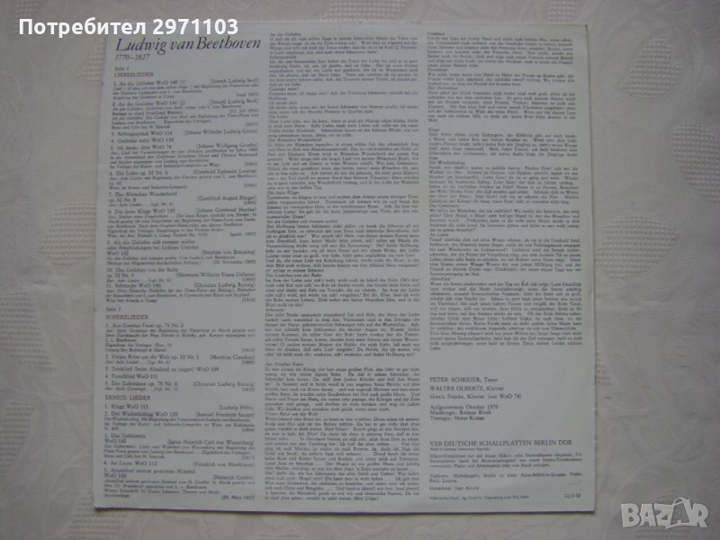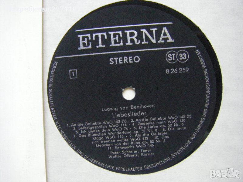 Грамофонна плоча - ETERNA – 8 26 259 - Ludwig van Beethoven, Peter Schreier, Walter Olbertz – Liebeslieder, Scherzlieder, Ernste Lieder,German Democratic Republic , 1972 година.