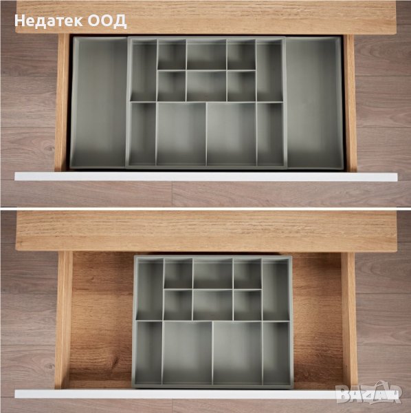 Разширяем пластмасов органайзер за чекмеджета. Има 12 места и странични чекмеджета, които се отварят и дават още 2 места. Чекмеджетата могат да се отварят заедно, поотделно или и двете според нуждите. Разполага с 4 седалки 5x12x3cm, 2 седалки 9.5x12x3cm, 2 седалки 7.5x6x3cm и 4 седалки 5.5x6x3cm. Страничните джобове са до 11x25x3cm (с отворени странични джобове са 52x25.5x3.8cm)