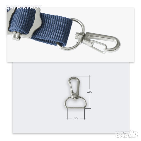 Карабинките, с различни размери при основата, са подходящи за кожени и текстилни презрамки със същата ширина. Използват се от шивачи, любители "направи си сам" и хора, занимаващи се с художествени професии. Освен като презрамки и дръжки за чанти, те са чудесен аксесоар, който придава завършен и модерен вид на различни кожени и текстилни изделия. Карабинката позволява бързо откачане на ремъка от другата част на продукта, а въртящата се основа не позволява усукването му.