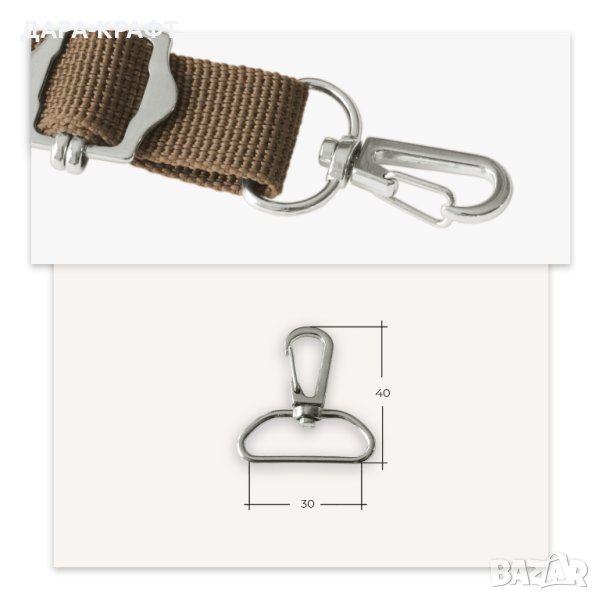 • Употреба - тези карабинки най-често се използват като закопчалки за презрамки, дръжки на чанти, сакове, раници от кожа или текстил. Карабинките имат въртяща се основа, която не позволява усукване на дръжката. Различните ширини на основата съответстват на най-често използваните размери презрамки при изработката на чанти.