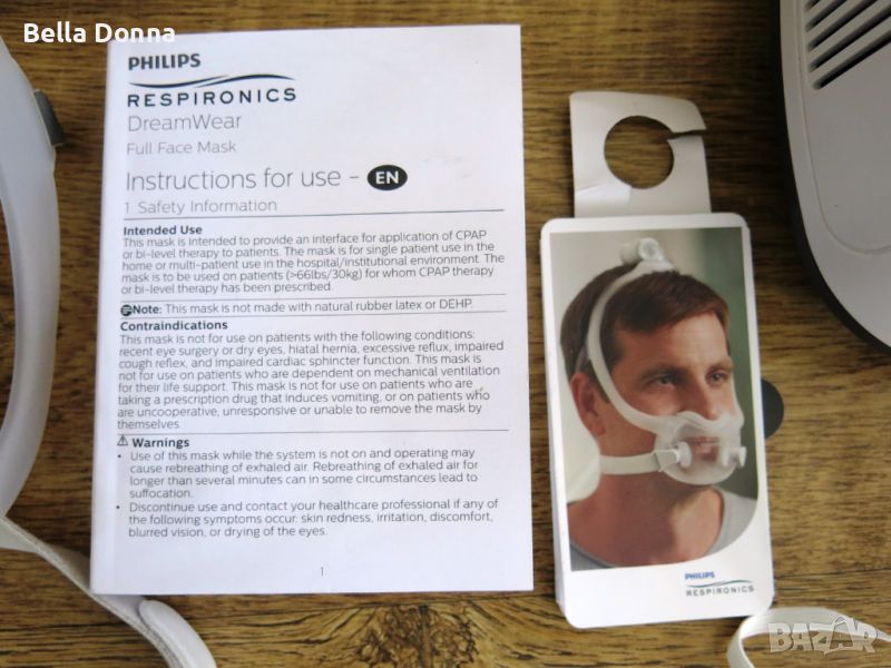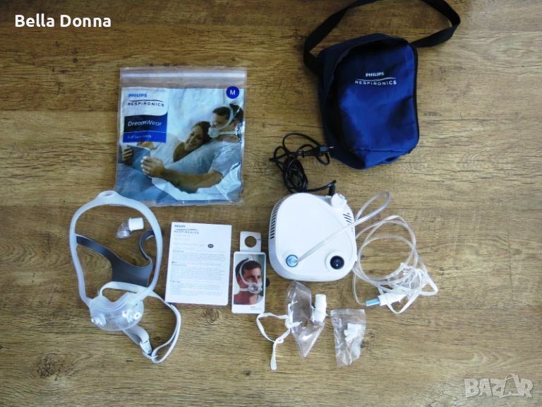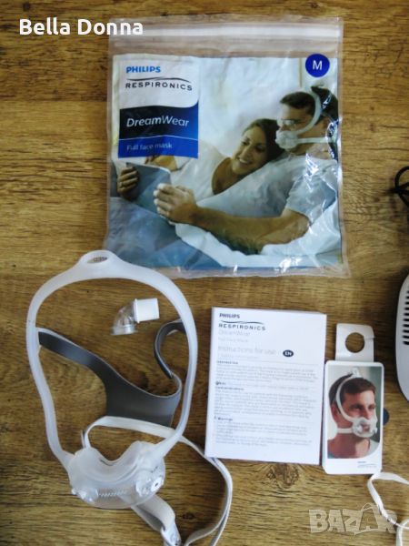 инхалатор с допълнителна лицева маска DreamWear, размер М. Използван, но в много добро, чисто състояние. Работи без проблем.