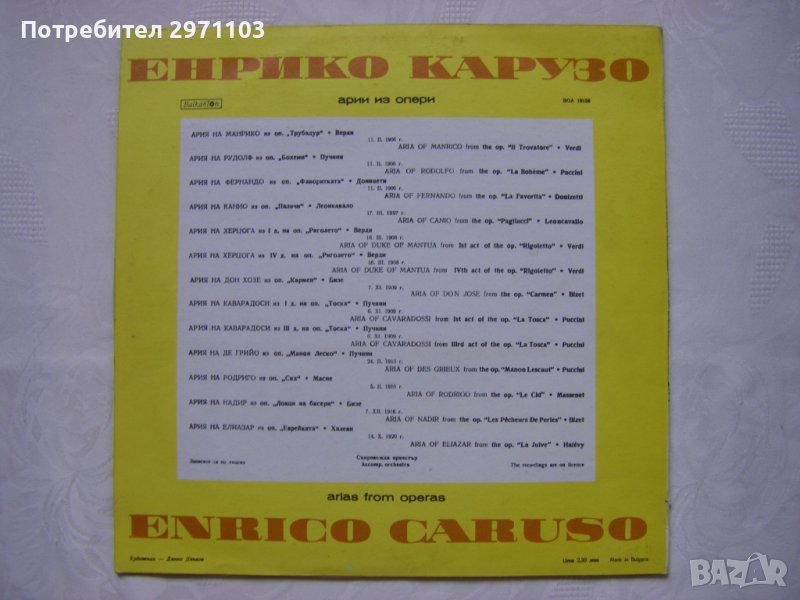 Грамофонна плоча - ВОА 10156 - Енрико Карузо. Арии из опери