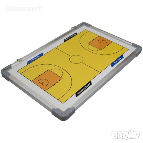 Магнитна треньорска дъска за баскетбол. Предназначена за учители и треньори по време на тренировки и мачове. За нагледно представяне на тактиката и съставяне на стратегия за защита или атака на отбора, и за разпределение на играчите по терена. Дъската има две страни – едната е със схема на цяло баскетболно игрище, а другата е с половин терен в по-едър мащаб. В комплекта са включени магнити за по-добро онагледяване на игровата ситуация, два маркера и гъбичка. ВНИМАНИЕ! Не пишете с перманентен маркер! Дъската разполага с кукички за закачане на стена. Размери - 45х30х2 см. Тегло за комплект - 600 г.