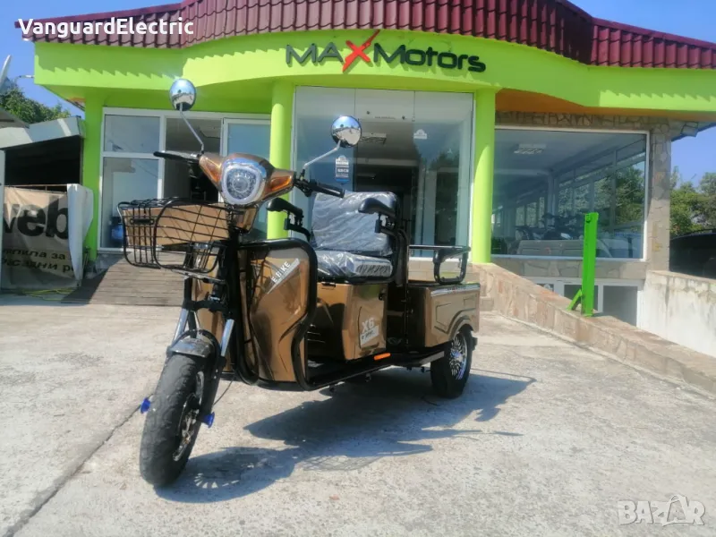 Електрическа триколка MaxMotors CARGO – LUX. Моделът е изключително атрактивен и подходящ за разходка на един или двама пътници. Задната седалка с едно движение се повдига и задната част се превръща в място за товар. Страничната част на задното отделение е със врата, което допълнително допринася за удобното пренасяне на товари. Последен модел на такъв тип триколки – нищо общо с предлаганите подобни на пазара. Изключително функционални, както за града, така и за по-малките населени места.