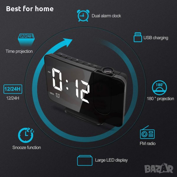 Функция за дрямка и двоен алармен часовник: Нашият алармен часовник с проектор може да зададе две отделни алармени часове едновременно, за да отговори на различните алармени часове за вас и вашето семейство. Можете също да зададете времето за дрямка според собствените си навици. Времето за дрямка на будилника е 9 минути.