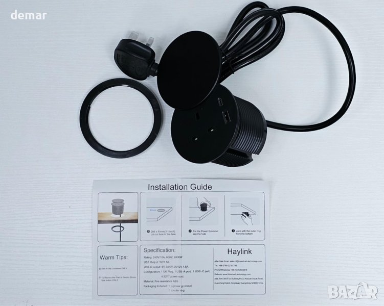 Този настолен електрически контакт е снабден с 1 UK щепсел, 1 USB-A порт и 1 USB-C порт. Той елиминира необходимостта от обемисти адаптери и заплетени удължителни кабели, като ви помага да поддържате чист и организиран работен плот. Изходът USB-A е 5V/2.1A, а изходът USB-C е 5V 3A/9V 2A/12V 1.5A. Той разполага с технология за интелигентно зареждане, която идентифицира свързаните ви USB устройства и настройва текущия изход, за да осигури оптимална ефективност на зареждането, като гарантира, че вашите устройства се зареждат бързо. Пасва на стандартни 3-инчови отвори. Можете да създадете 3,15-инчов (80 мм) отвор в работния плот или да използвате съществуващ отвор за кабел. Поставете втулката за захранване, завийте пръстена отдолу и сте готови за работа. Този настолен електрически контакт предлага защита срещу различни опасности, включително свръхнапрежение, свръхток, презареждане, късо съединение и прегряване. В допълнение, плъзгащият се капак е проектиран да предпазва от вода и мръсотия, повишавайки безопасността и издръжливостта.