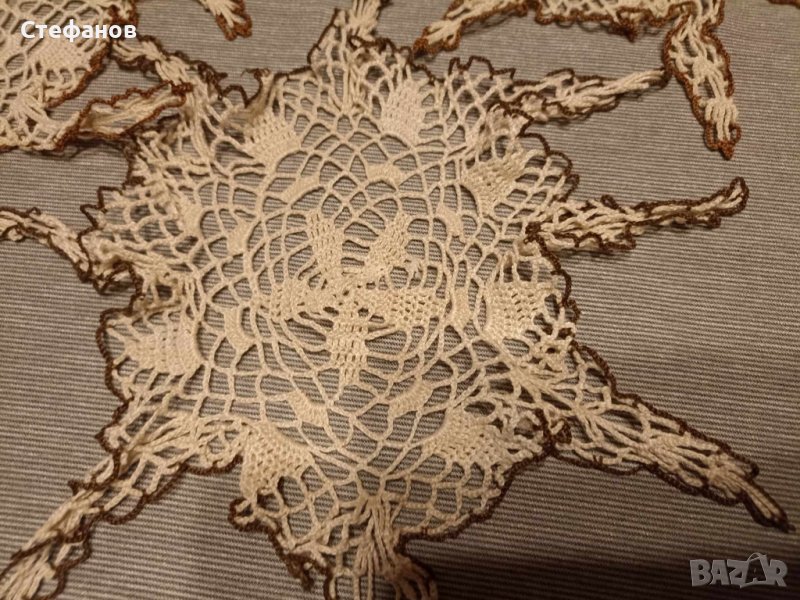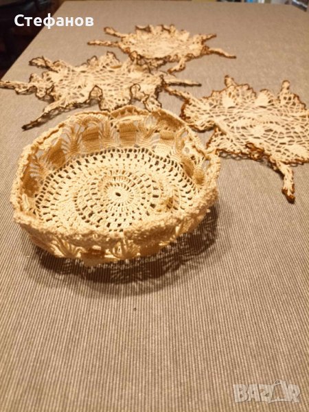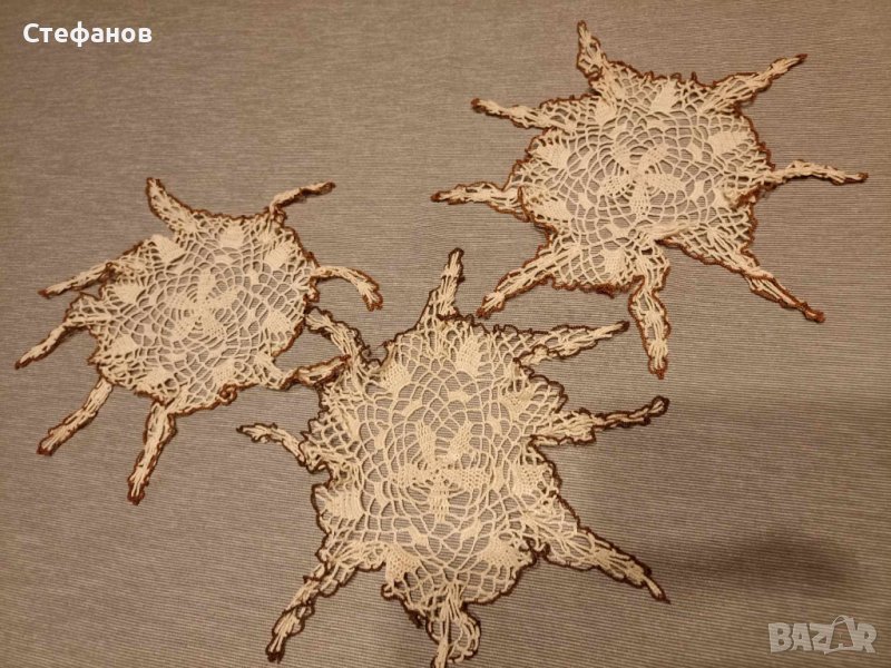 Три броя малки карета с дълги странички като форма на звездички.Едно плетено каре като панерче за пълнене с бонбони.Отбелязвам като използвани заради дългото време на съхранение.Нуждаят се от изглаждане с ютия.Цена за всичките четири броя-15 лева.