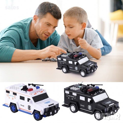 ✔️АЛАРМЕНА СИСТЕМА Светлините на автомобила мигат и задната врата на колата се отваря автоматично. Ако въведете неправилен код, алармата на покрива на кабината ще започне да издава звук и ще мига. Тази касичка ще бъде чудесно изживяване за вашите деца.