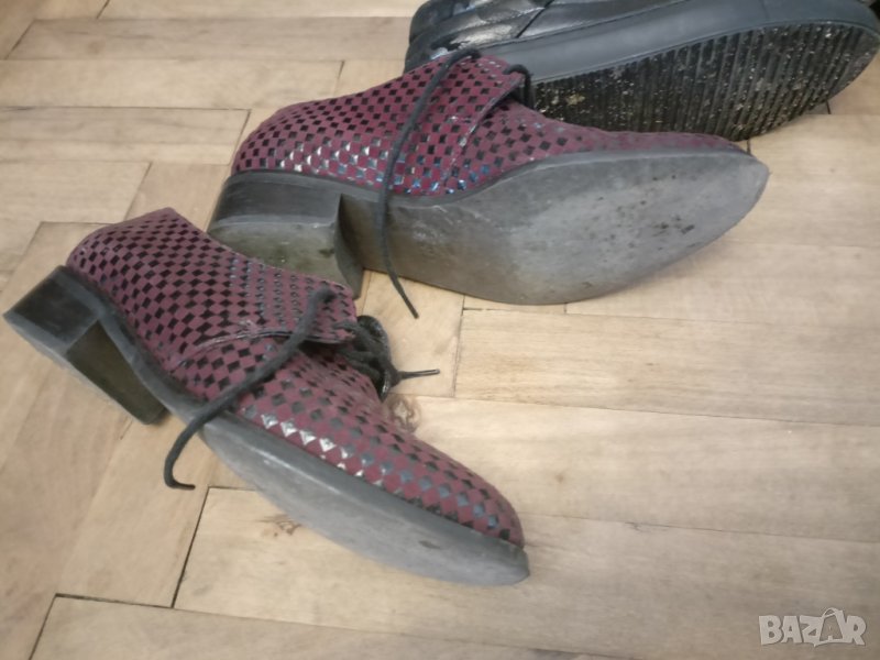 Три чифта естествена кожа обувки, използвани, но запазени, с връзки, меки, удобни, за ежедневно ходене, с връзки- бели, на дупки, черни-мека естествена кожа и виненочервени с интересна релефна кожа- стелките са 23.5 см.