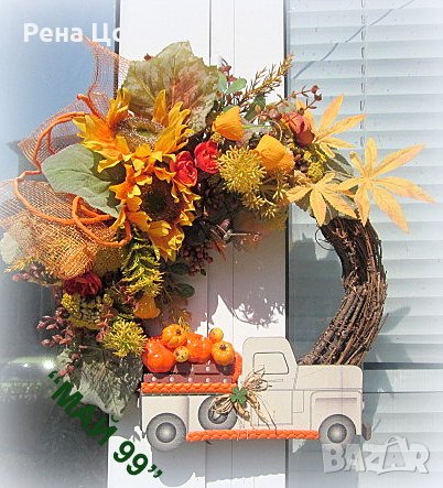Есенен венец на основа натурални пръчки ф 30 см/без декорацията/ с изкуствени и натурални клонки,листа,шишарки и слънчогледи,дървен/плосък/камион с изкуствени малки тиквички и богата панделка мрежа и шнур