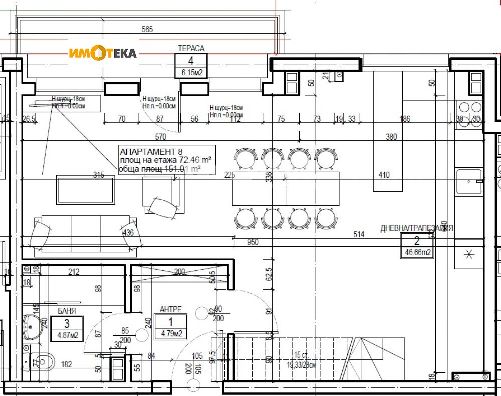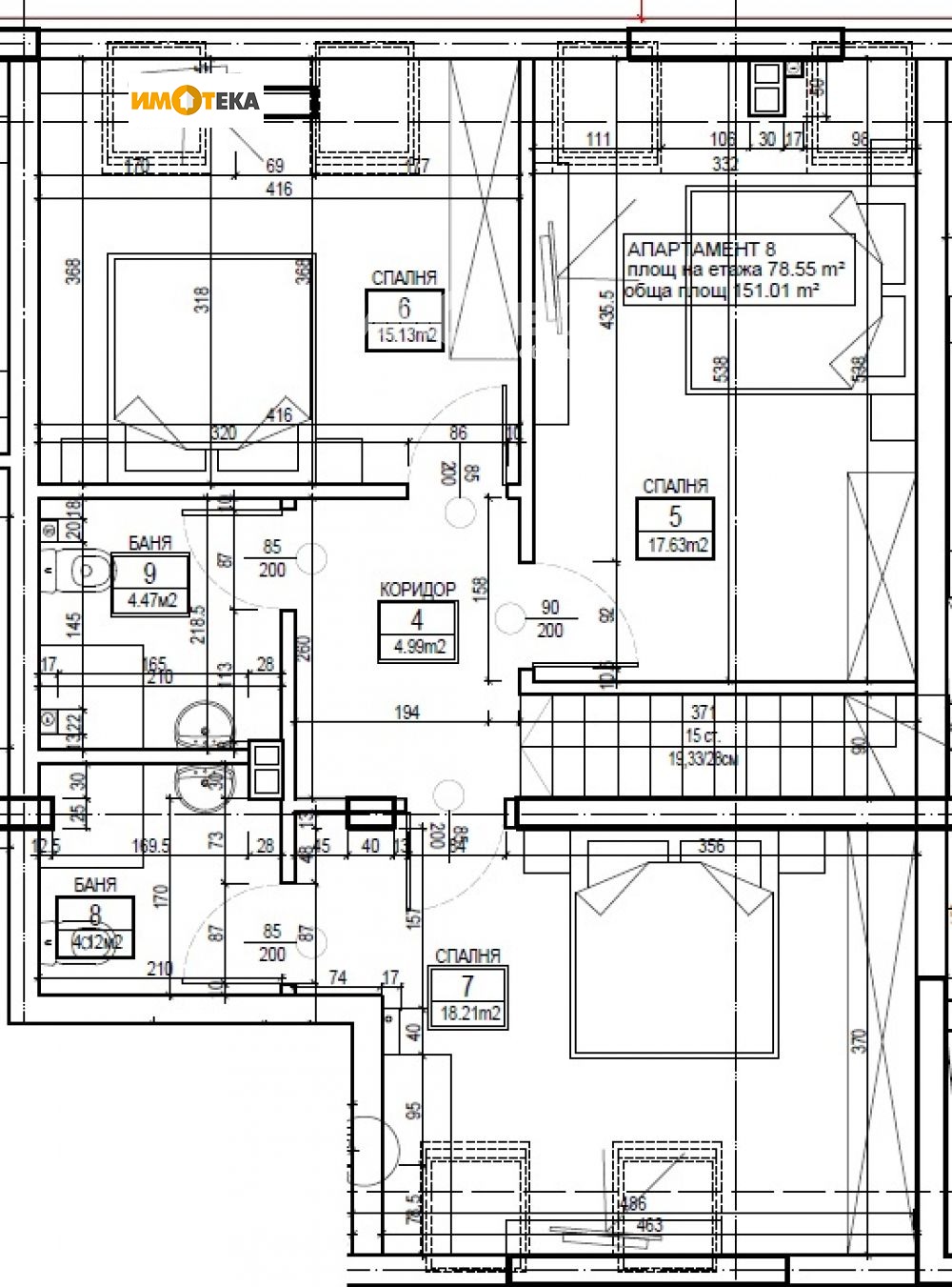 Многостаен апартамент, тип мезонет. Ниво едно е със застроена площ от 74.22 кв.м. и се състои се от: входно антре, баня с тоалетна, голяма дневна с кухненски бокс и излаз на тераса. Ниво две е със застроена площ от 78.55 кв.м. и се състои от: коридор, баня с тоалетна и три спални, една от които с баня и тоалетна.