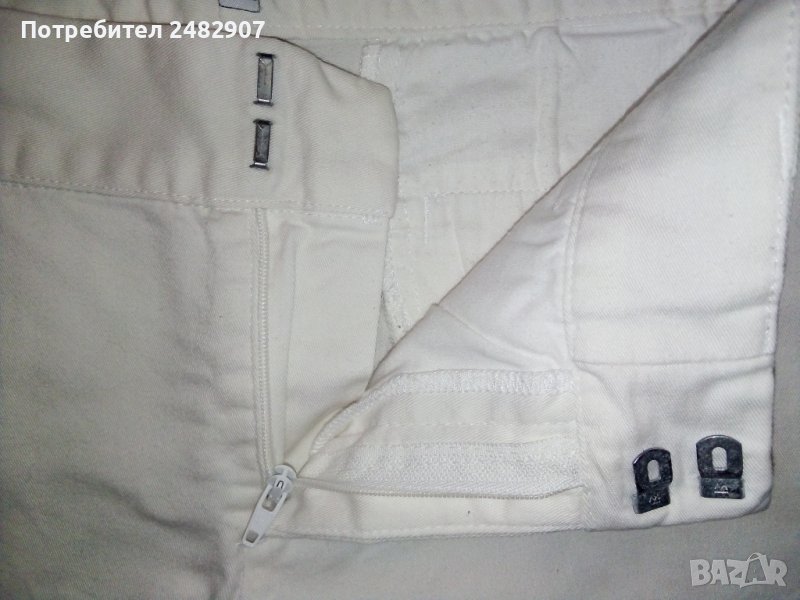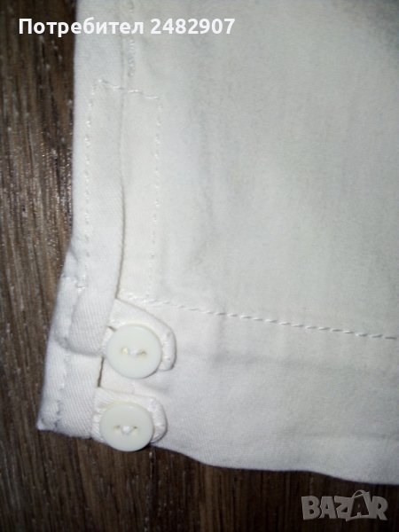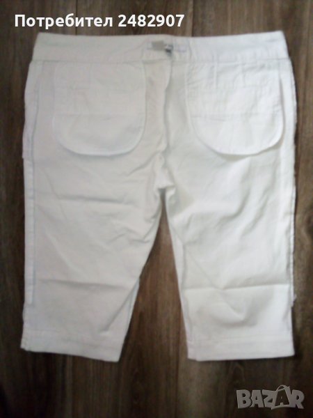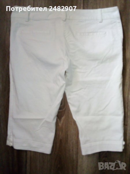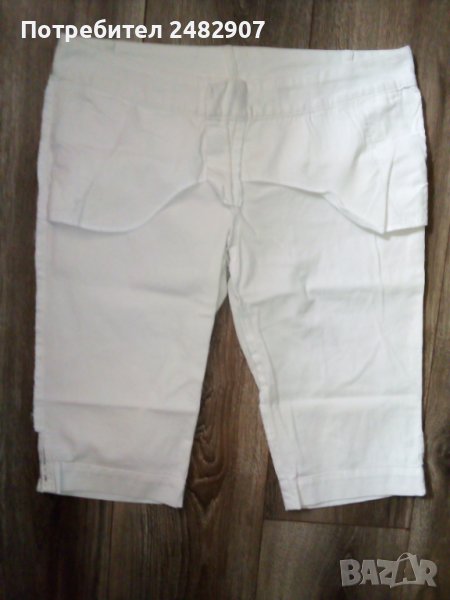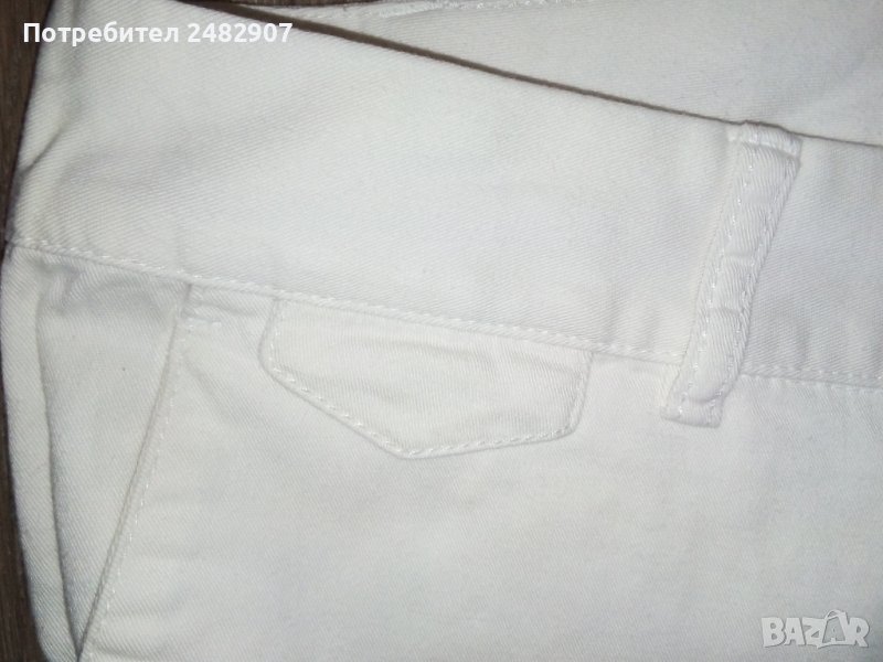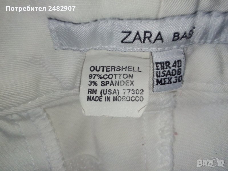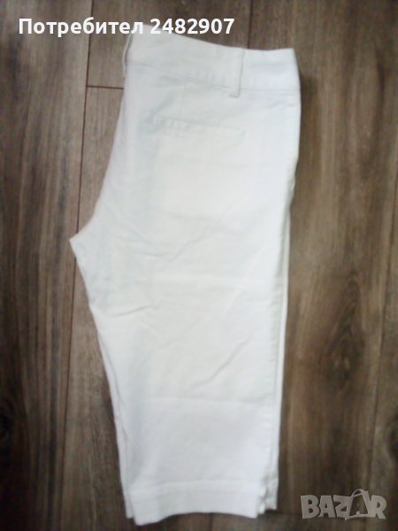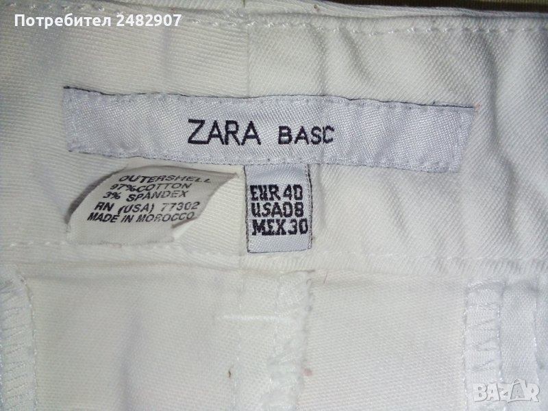 Бели дамски бермуди ZARA, размер 40. Съдържат 97 % памук и 3 % спандекс. Ширина в талията - 41,5 см, дължина от талията до чатала - 19 см, дължина от талията до долу - 54,5 см, ширина на крачола в долната част - 19 см. Много запазени, почти не са използвани, с два странични джоба и два отзад. Закопчаване с цип и 2 броя телени копчета, с гайки в талията и с по две малки копчета в долната странична част на крачола.