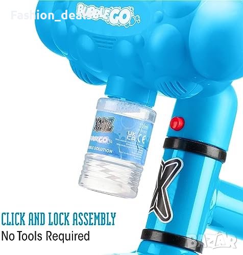 Включва над 500 мл разтвор за мехурчета (има възможност за доливане) и изисква 6 батерии АА (не са включени в комплекта).